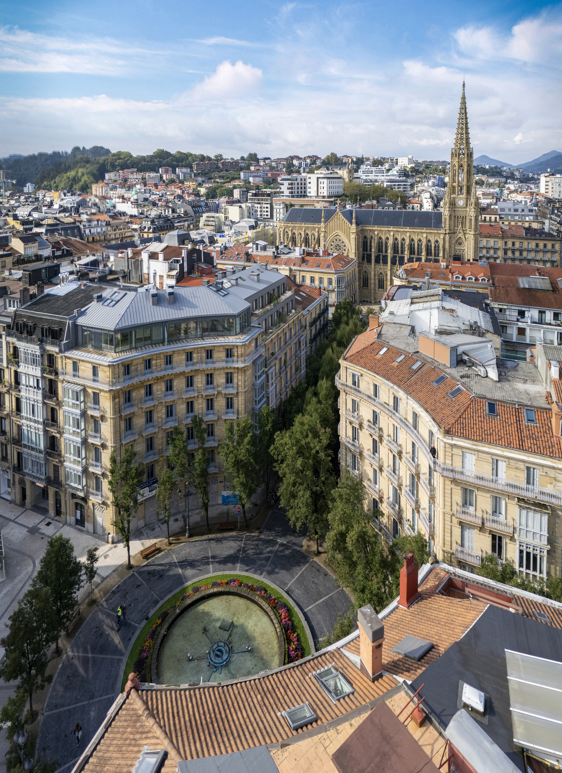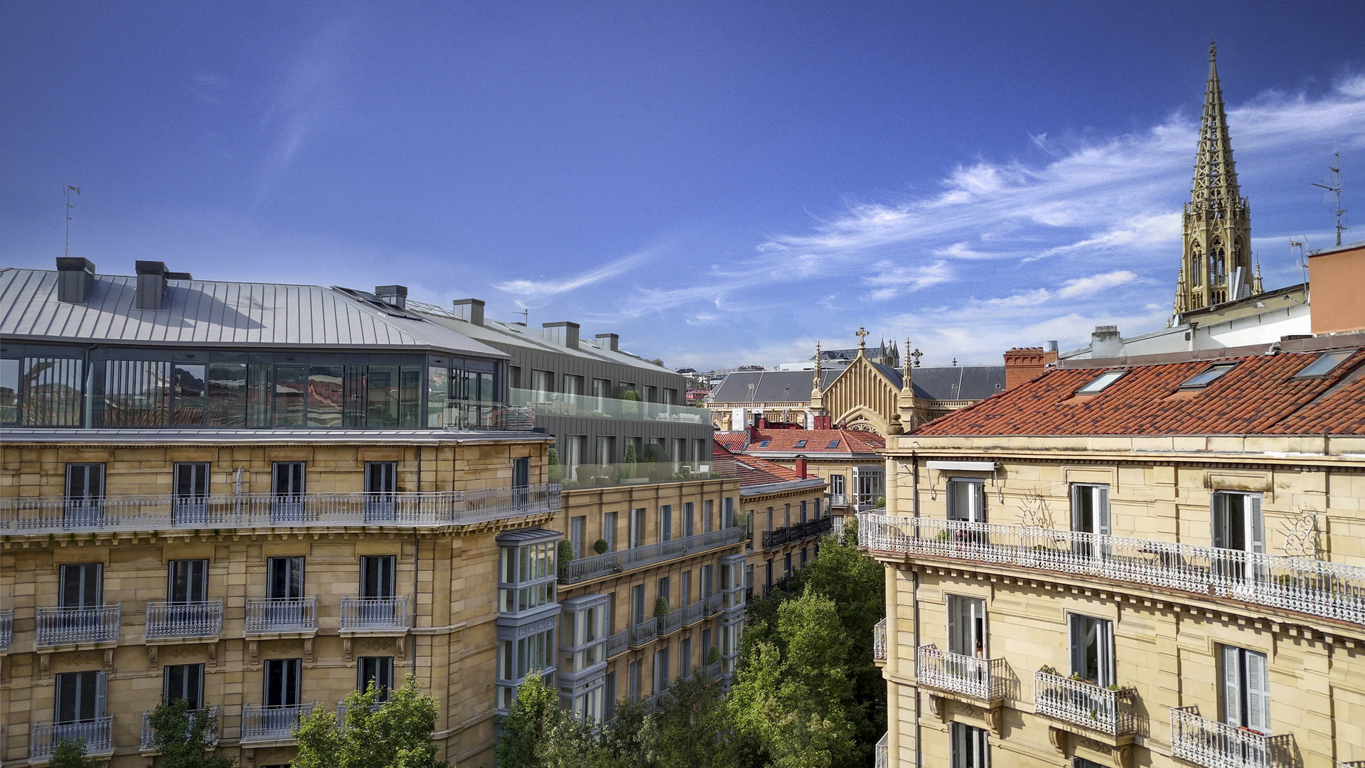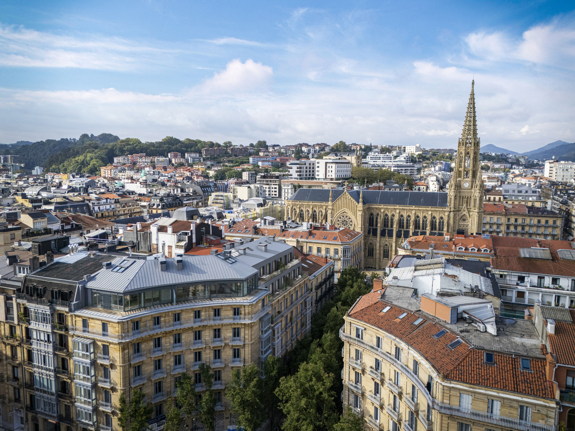Rehabilitación integral de un edificio histórico en el corazón de Donostia, junto a la Catedral del Buen Pastor. El proyecto combina la elegancia de la arquitectura clásica con una ampliación moderna de dos plantas. Interiores de alto standing, con techos altos con molduras, suelos en espiga y murales decorativos que evocan la tradición del edificio.