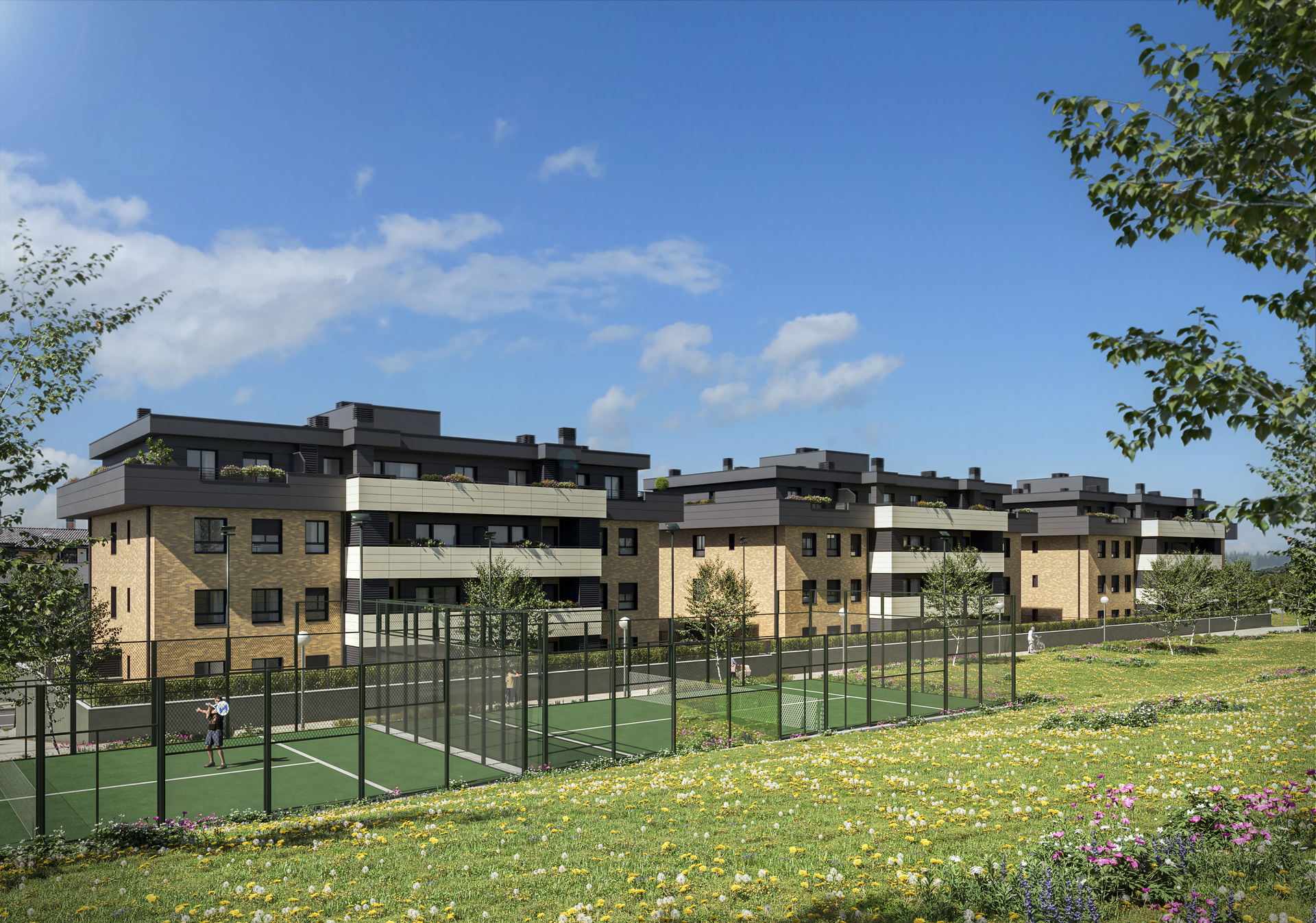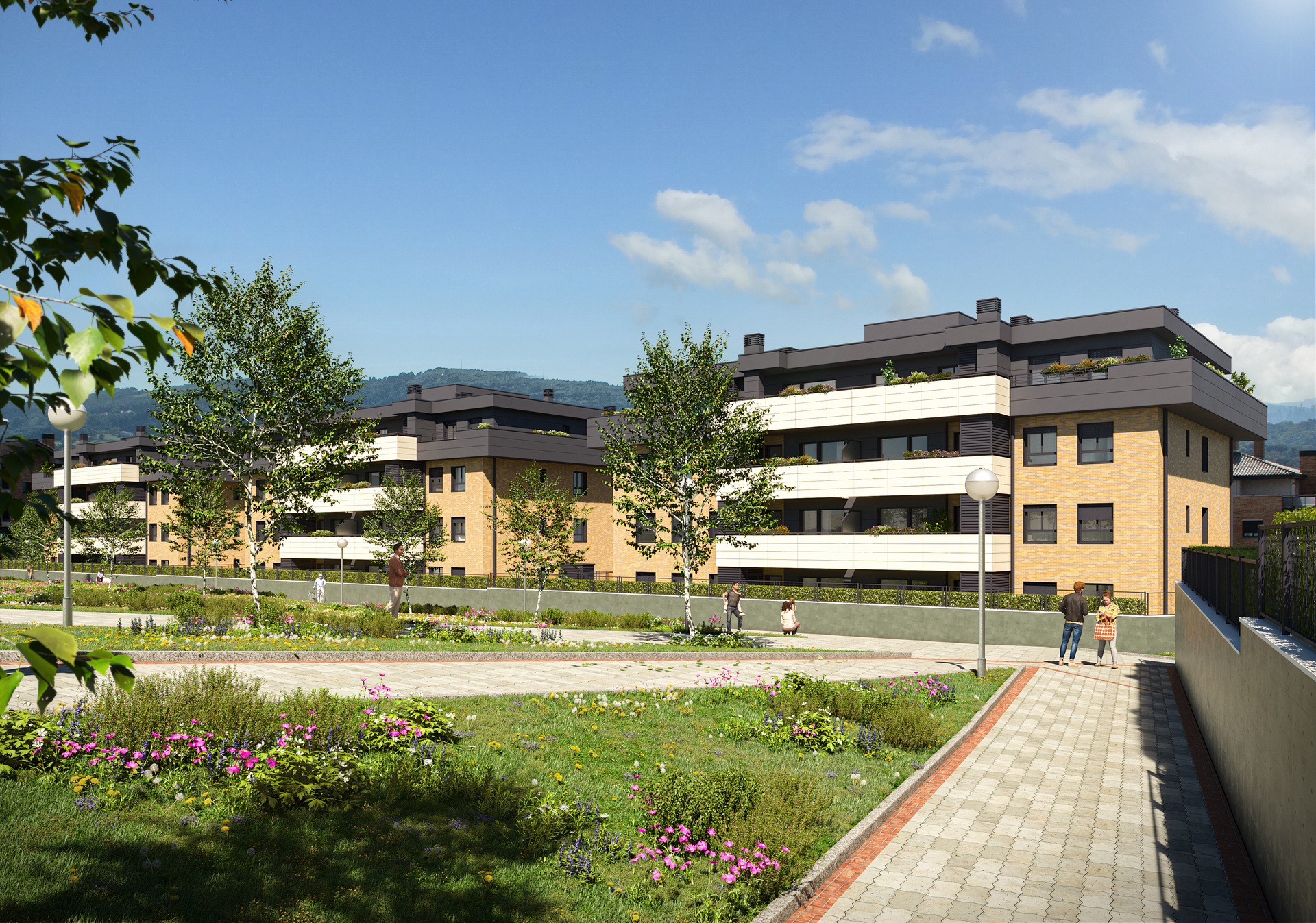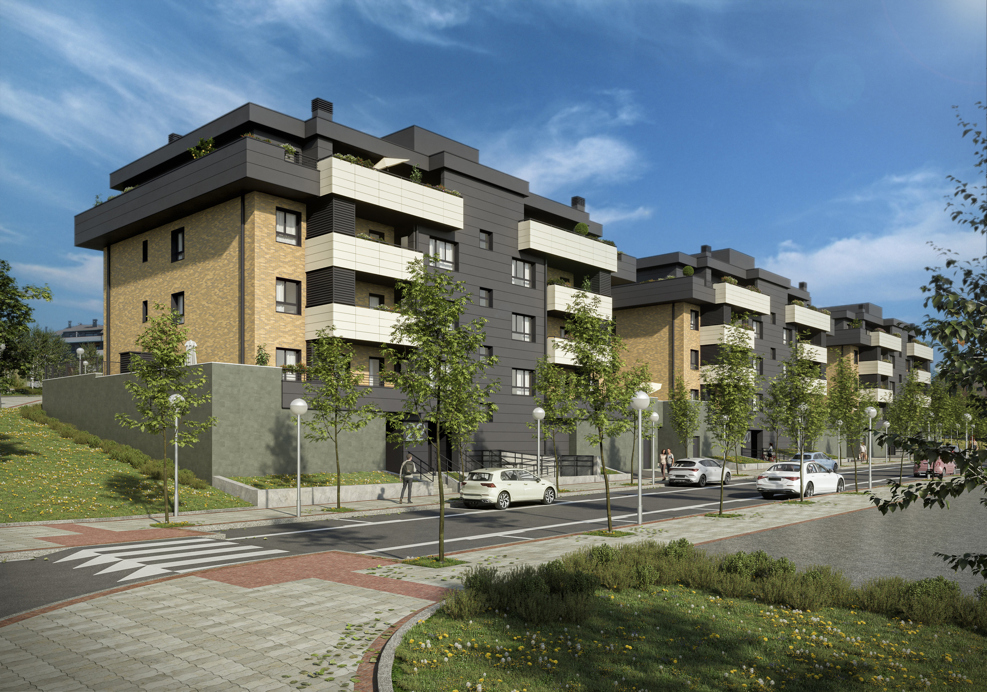 Promoción residencial en Derio con una arquitectura que combina ladrillo visto y paneles oscuros, creando un contraste visual atractivo. Los interiores destacan por sus amplios salones con cocina abierta, elementos decorativos en madera natural y terrazas con vistas al entorno verde del municipio.