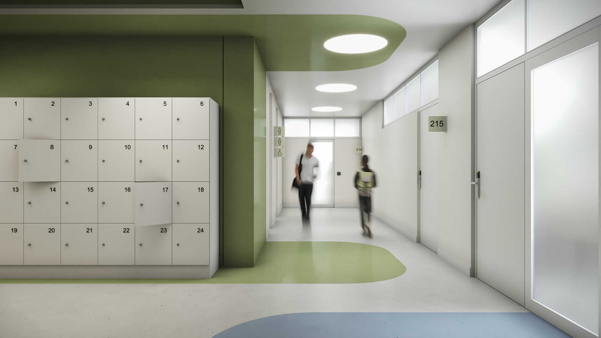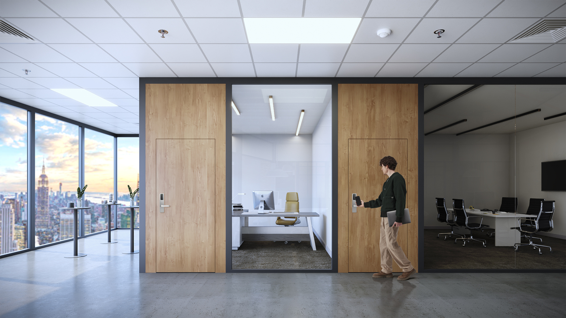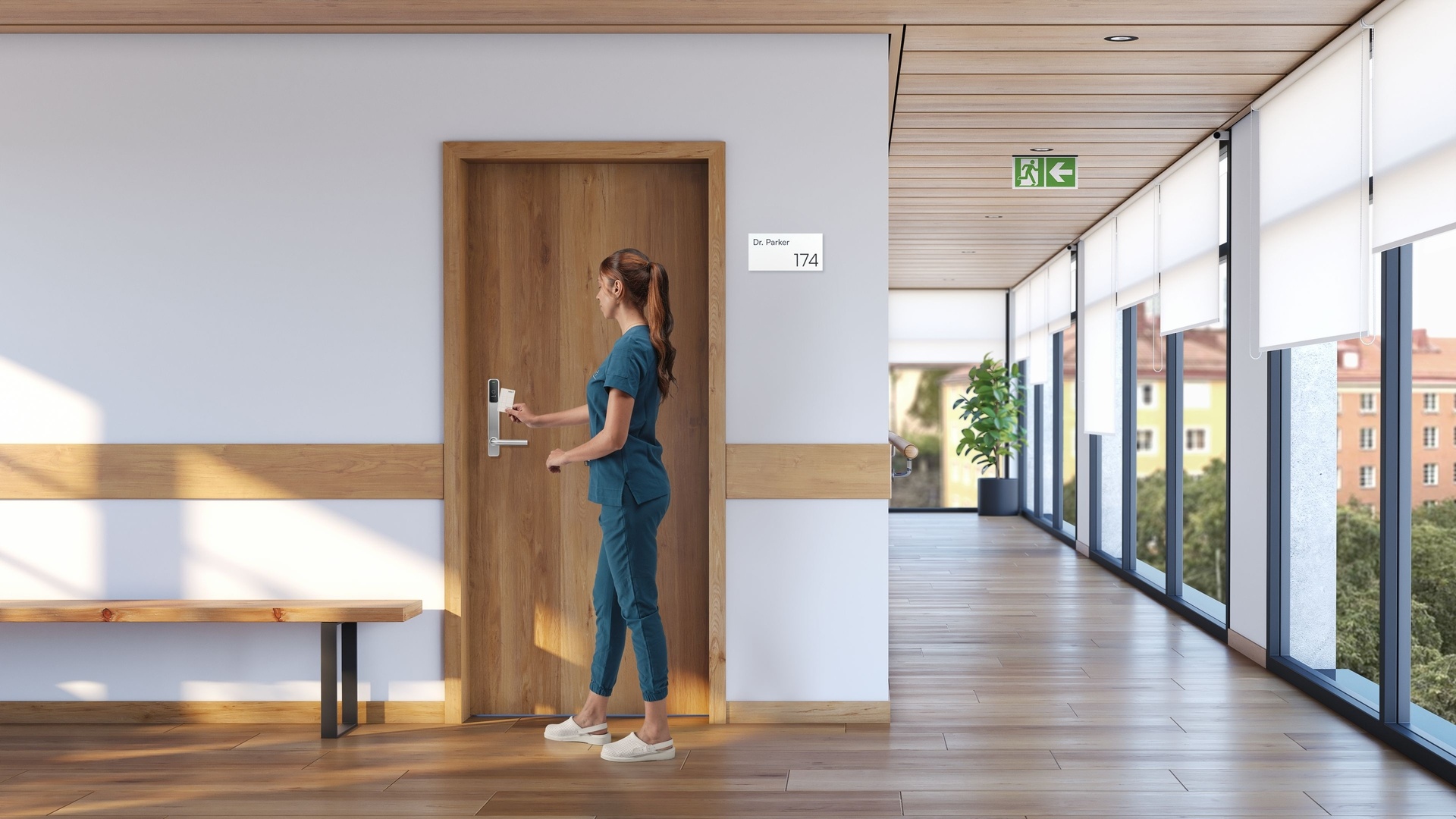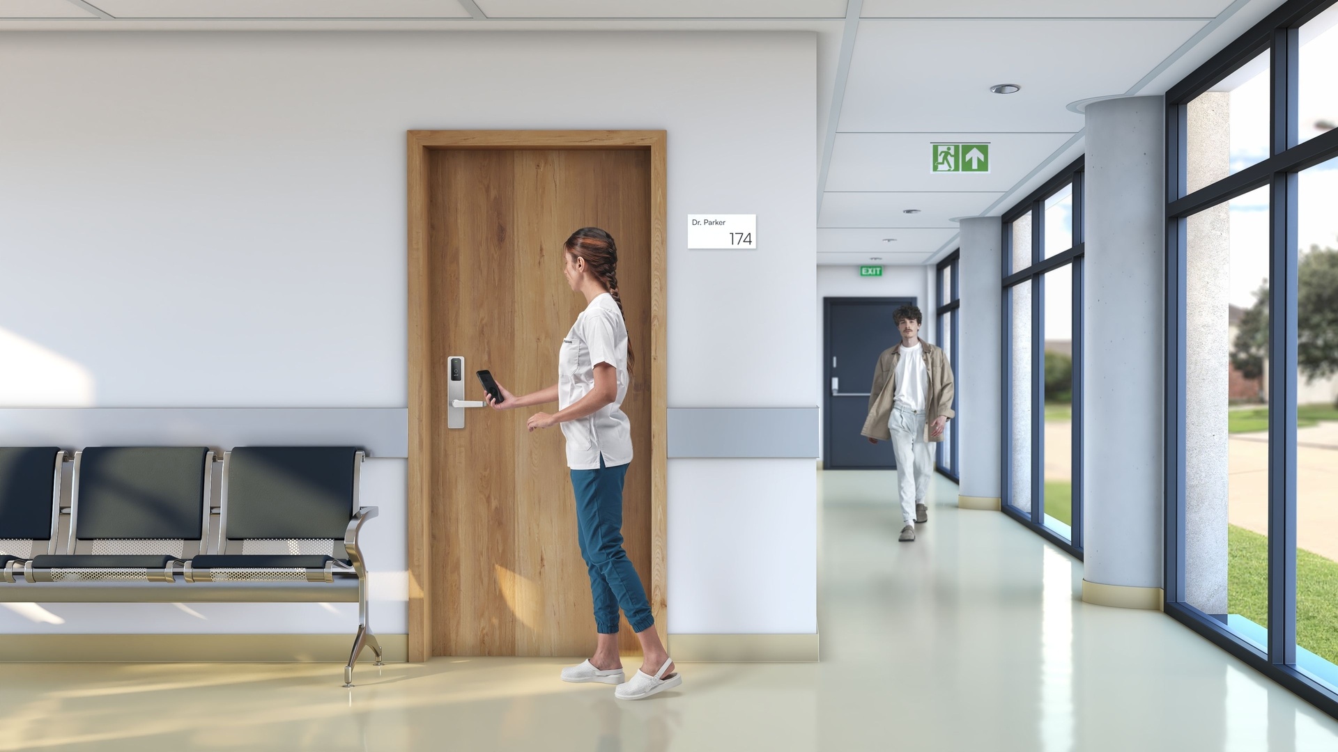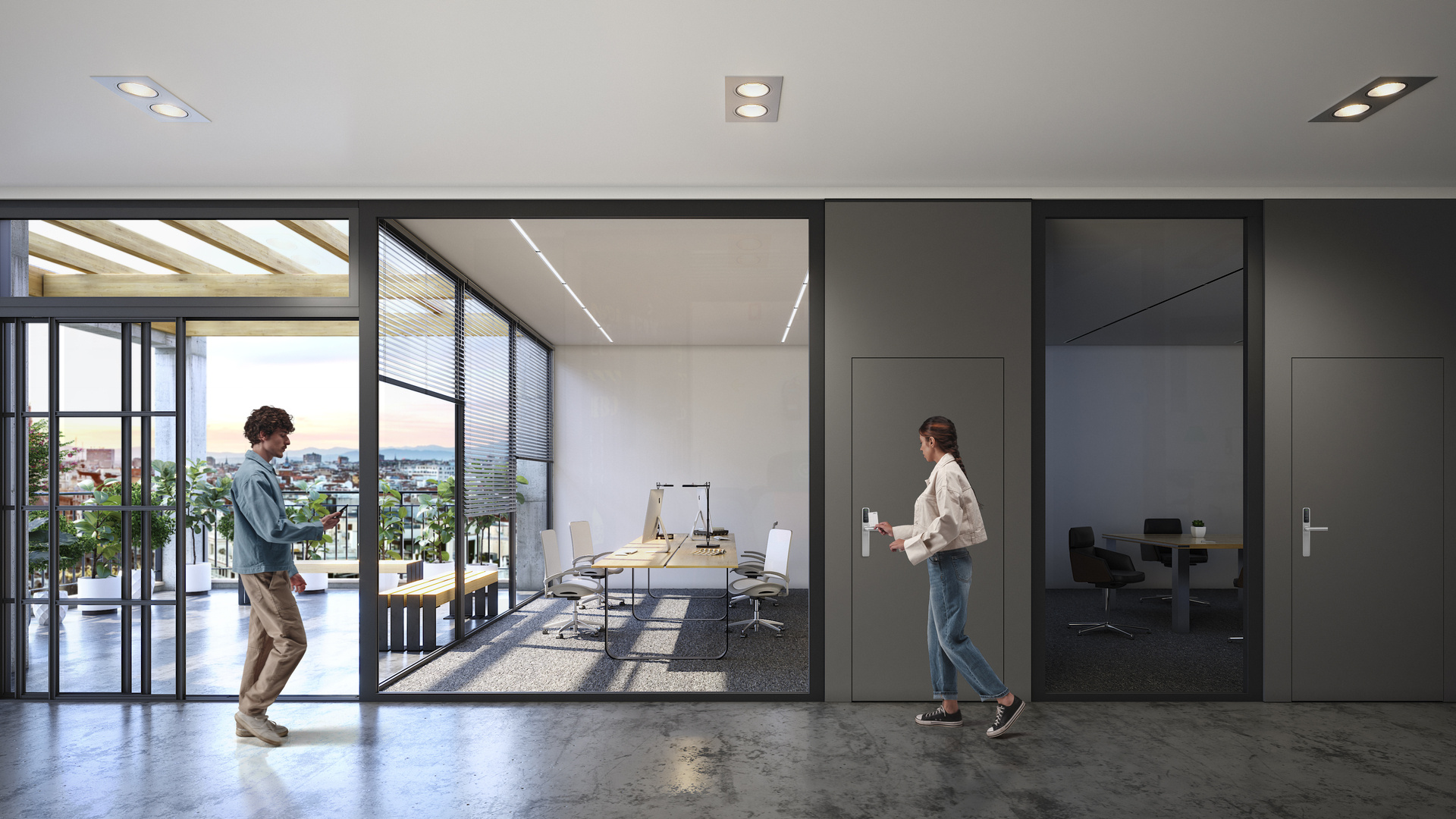 Visualización de producto para sistemas de control de acceso SALTO. Los renders muestran la integración de las soluciones en distintos entornos profesionales como oficinas, hospitales y espacios de coworking, destacando la versatilidad y el diseño del producto en situaciones reales de uso.